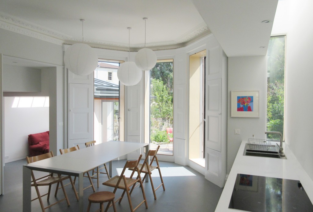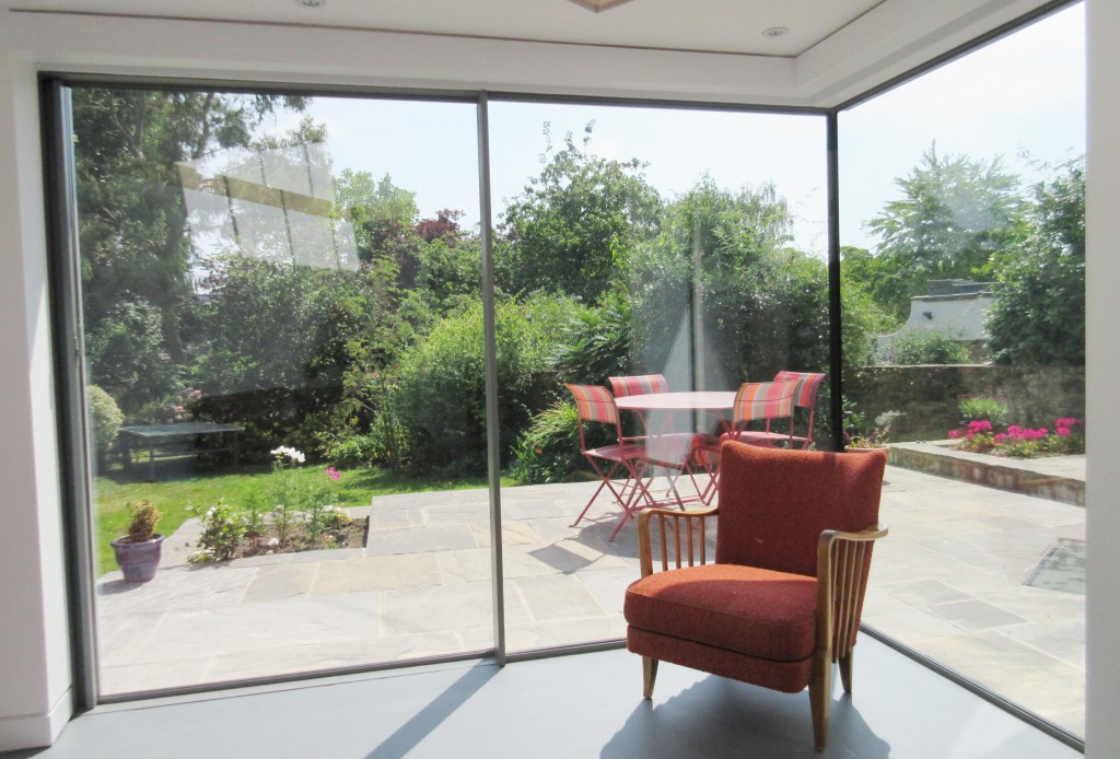 The existing timber floor to the kitchen was replaced with a composite steel deck and concrete slab which cantilevered through a large new opening in the external wall and supported the new pop out bay. The garden room featured a frameless glazed corner with cantilevering beams to support the roof giving a large uninterrupted opening into the garden.